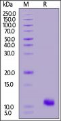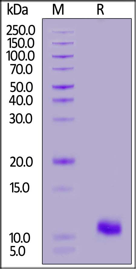 This protein carries a polyhistidine tag at the C-terminus. The protein has a calculated MW of 7.1 kDa. The protein migrates as 10-12 kDa under reducing (R) condition (SDS-PAGE) due to glycosylation.