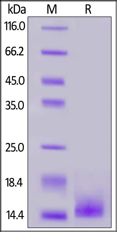 This protein carries a polyhistidine tag at the C-terminus. The protein has a calculated MW of 7.9 kDa. The protein migrates as 13-14 kDa when calibrated against Star Ribbon Pre-stained Protein Marker under reducing (R) condition (SDS-PAGE) due to glycosylation.