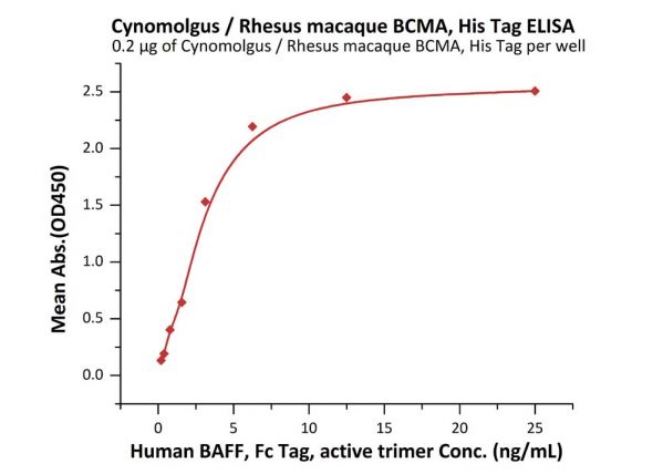 Cynomolgus / Rhesus macaque BCMA, His Tag (BCA-C52H7) is expressed from human 293 cells (HEK293). It contains AA Met 1 - Ala 53 (Accession # A0A2K5UD97-1). In the region Met 1 - Ala 53, the AA sequence of Cynomolgus and Rhesus macaque BCMA are homologus.