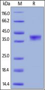 This protein carries a mouse IgG2a Fc tag at the C-terminus. The protein has a calculated MW of 32.8 kDa. The protein migrates as 35-42 kDa under reducing (R) condition (SDS-PAGE) due to glycosylation.