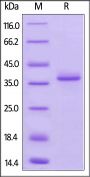 This protein carries a human IgG1 Fc tag at the C-terminus. The protein has a calculated MW of 32.1 kDa. The protein migrates as 36 kDa under reducing (R) condition (SDS-PAGE) due to O-linked glycosylation which has been verified by O-Glycosidase and Neuraminidase digestion.