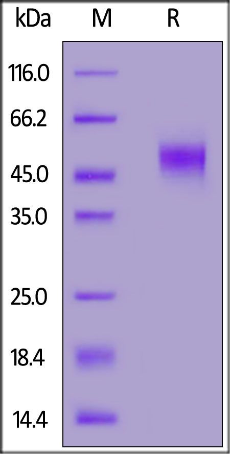 This protein carries a polyhistidine tag at the C-terminus. The protein has a calculated MW of 34.3 kDa. The protein migrates as 45-55 kDa under reducing (R) condition (SDS-PAGE) due to glycosylation.