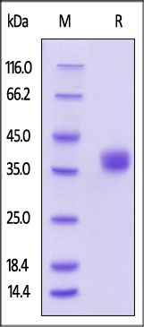 This protein carries a polyhistidine tag at the C-terminus. The protein has a calculated MW of 25.8 kDa. The protein migrates as 30-37 kDa under reducing (R) condition (SDS-PAGE) due to glycosylation.