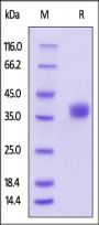 This protein carries a polyhistidine tag at the C-terminus. The protein has a calculated MW of 25.8 kDa. The protein migrates as 30-37 kDa under reducing (R) condition (SDS-PAGE) due to glycosylation.