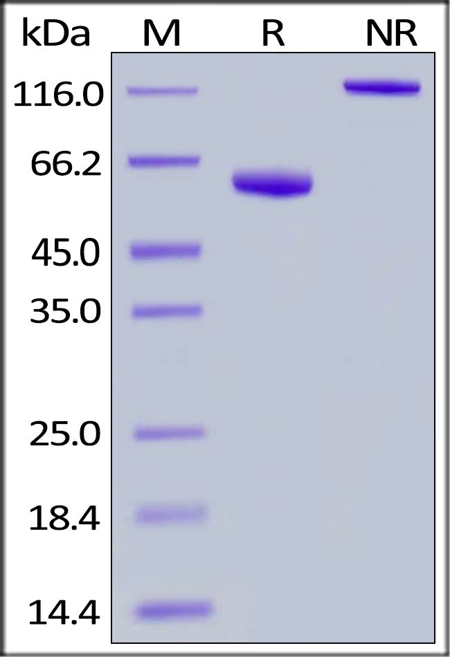 This protein carries a human IgG1 Fc tag at the C-terminus. The protein has a calculated MW of 50.8 kDa. The protein migrates as 58-65 kDa under reducing (R) condition, and 120 kDa under non-reducing (NR) condition (SDS-PAGE) due to glycosylation.