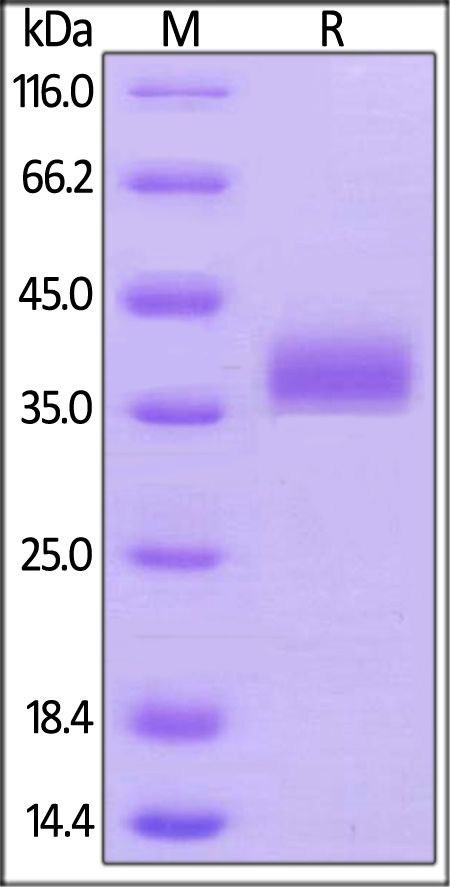 This protein carries a polyhistidine tag at the C-terminus, followed by an Avi tag (Avitag™). The protein has a calculated MW of 27.6 kDa. The protein migrates as 36-40 kDa under reducing (R) condition (SDS-PAGE) due to glycosylation.