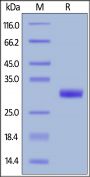 This protein carries a polyhistidine tag at the C-terminus, followed by an Avi tag (Avitag™). The protein has a calculated MW of 27.3 kDa. The protein migrates as 30-33 kDa under reducing (R) condition (SDS-PAGE) due to glycosylation.