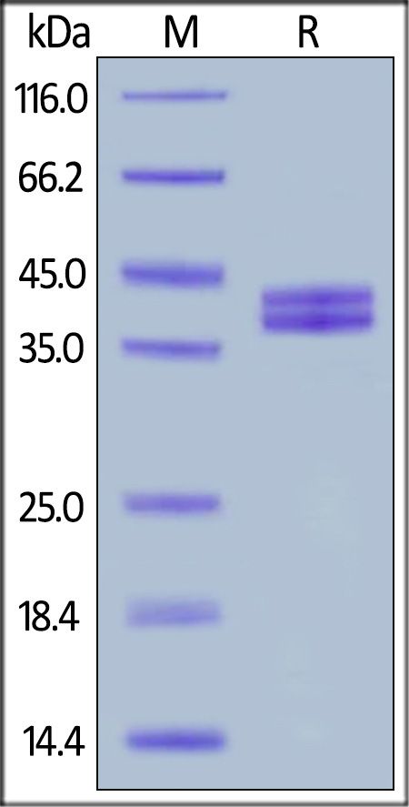 This protein carries a human IgG1 Fc tag at the C-terminus. The protein has a calculated MW of 34.6 kDa. The protein migrates as 38-40 kDa and 41-44 kDa under reducing (R) condition (SDS-PAGE) due to glycosylation.