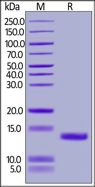 This protein carries a polyhistidine tag at the N-terminus. The protein has a calculated MW of 10.9 kDa. The protein migrates as 14 kDa when calibrated against Star Ribbon Pre-stained Protein Marker under reducing (R) condition (SDS-PAGE).