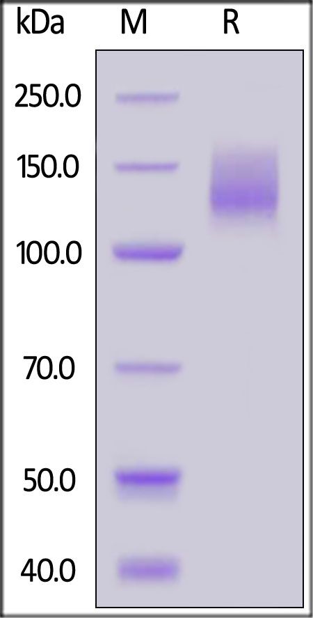 This protein carries a human IgG1 Fc tag at the C-terminus, followed by an Avi tag (Avitag™). The protein has a calculated MW of 100.0 kDa. The protein migrates as 120-160 kDa under reducing (R) condition (SDS-PAGE) due to glycosylation.