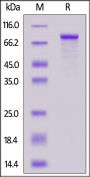 This protein carries a polyhistidine tag at the C-terminus. The protein has a calculated MW of 67.9 kDa. The protein migrates as 80-95 kDa when calibrated against Star Ribbon Pre-stained Protein Marker under reducing (R) condition (SDS-PAGE) due to glycosylation.