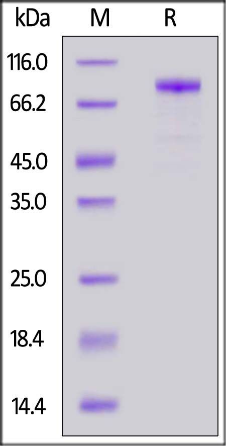 The protein has a calculated MW of 68.3 kDa. The protein migrates as 80-100 kDa under reducing (R) condition (SDS-PAGE) due to glycosylation.