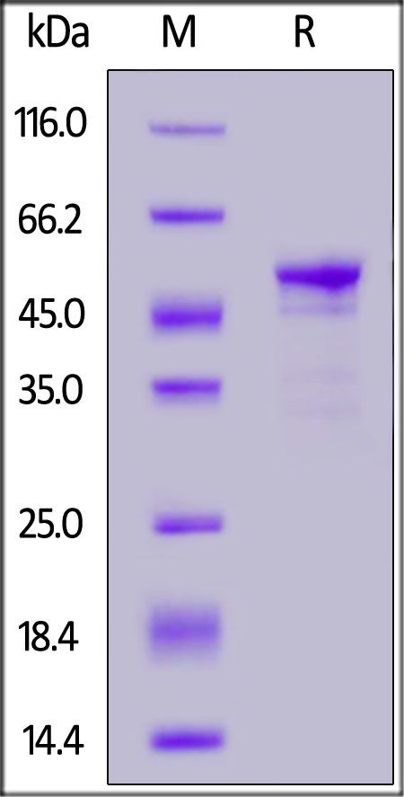 This protein carries a polyhistidine tag at the C-terminus. The protein has a calculated MW of 41.7 kDa. The protein migrates as 45-55 kDa under reducing (R) condition (SDS-PAGE) due to glycosylation.