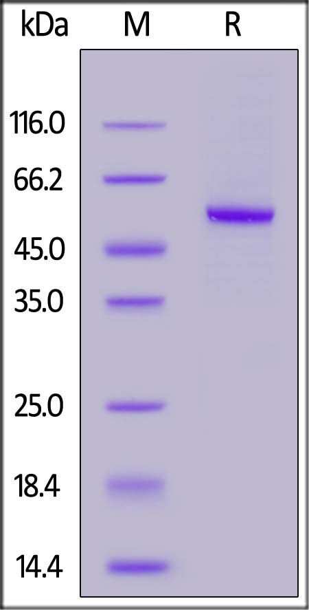 This protein carries a polyhistidine tag at the C-terminus, followed by an Avi tag (Avitag™). The protein has a calculated MW of 44.5 kDa. The protein migrates as 50-55 kDa under reducing (R) condition (SDS-PAGE) due to glycosylation.