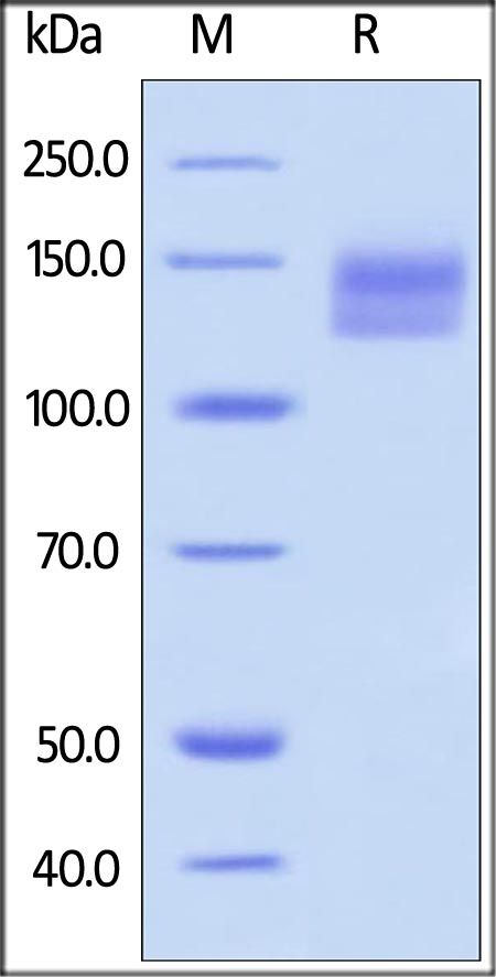 This protein carries a human IgG1 Fc tag at the C-terminus. The protein has a calculated MW of 105.4 kDa. The protein migrates as 125-160 kDa under reducing (R) condition (SDS-PAGE) due to glycosylation.