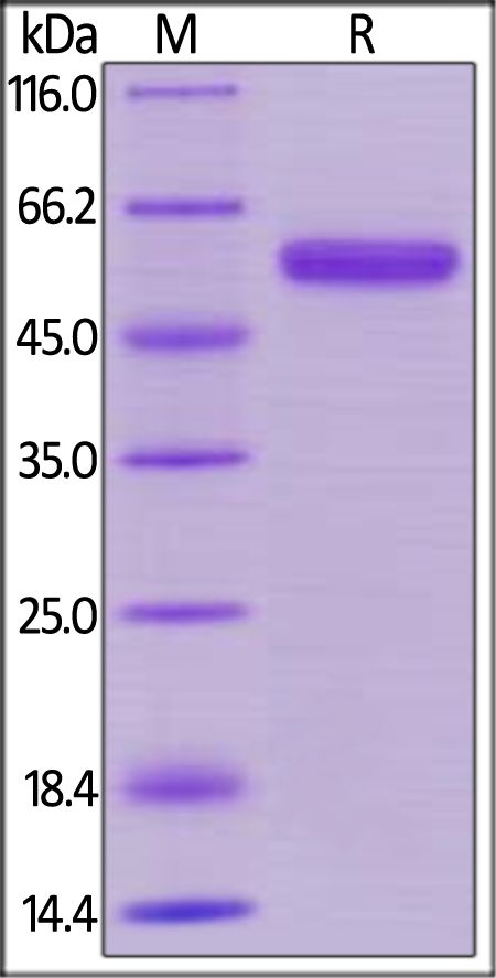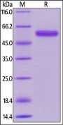 This protein carries a mouse IgG2a Fc tag at the C-terminus. The protein has a calculated MW of 46.1 kDa. The protein migrates as 58 kDa under reducing (R) condition (SDS-PAGE) due to glycosylation.