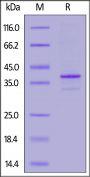 This protein carries a polyhistidine tag at the C-terminus. The protein has a calculated MW of 35.2 kDa. The protein migrates as 40 kDa when calibrated against Star Ribbon Pre-stained Protein Marker under reducing (R) condition (SDS-PAGE) due to glycosylation.