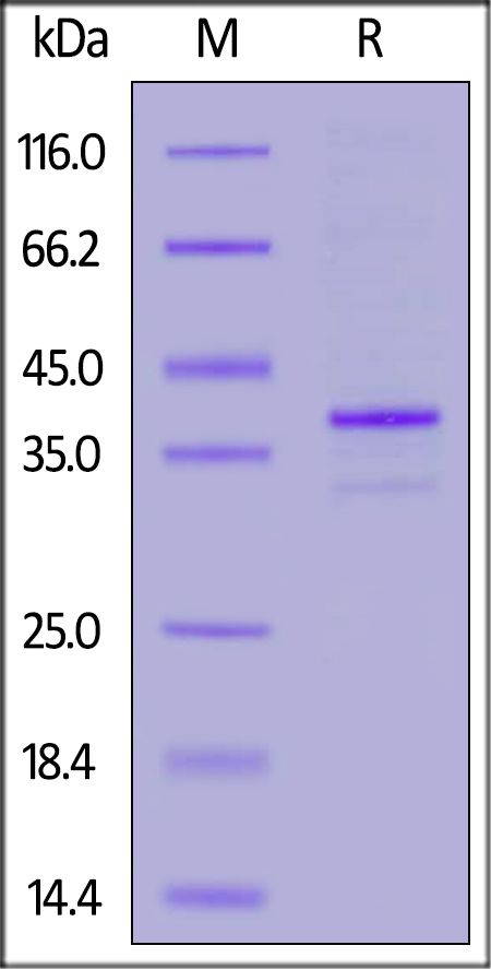 This protein carries a polyhistidine tag at the C-terminus. The protein has a calculated MW of 35.2 kDa. The protein migrates as 40 kDa when calibrated against Star Ribbon Pre-stained Protein Marker under reducing (R) condition (SDS-PAGE) due to glycosylation.