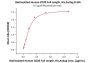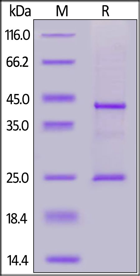 The CD20 carries a polyhistidine tag at the C-terminus followed by an Avi tag with calculated MW of 36.9 kDa and migrates as 43 kDa when calibrated against Star Ribbon Pre-stained Protein Marker under reducing (R) condition (SDS-PAGE) due to glycosylation.