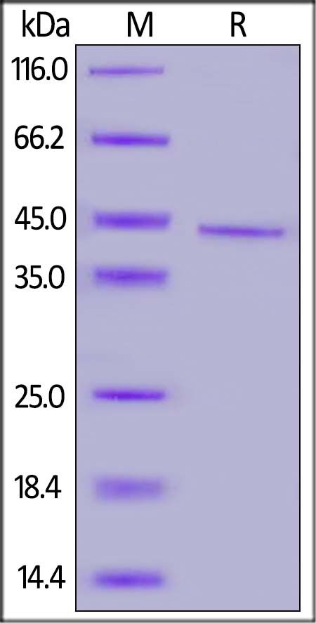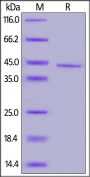 This protein carries a polyhistidine tag at the C-terminus, followed by an Avi tag (Avitag™). The protein has a calculated MW of 36.9 kDa. The protein migrates as 40 kDa when calibrated against Star Ribbon Pre-stained Protein Marker under reducing (R) condition (SDS-PAGE) due to glycosylation.