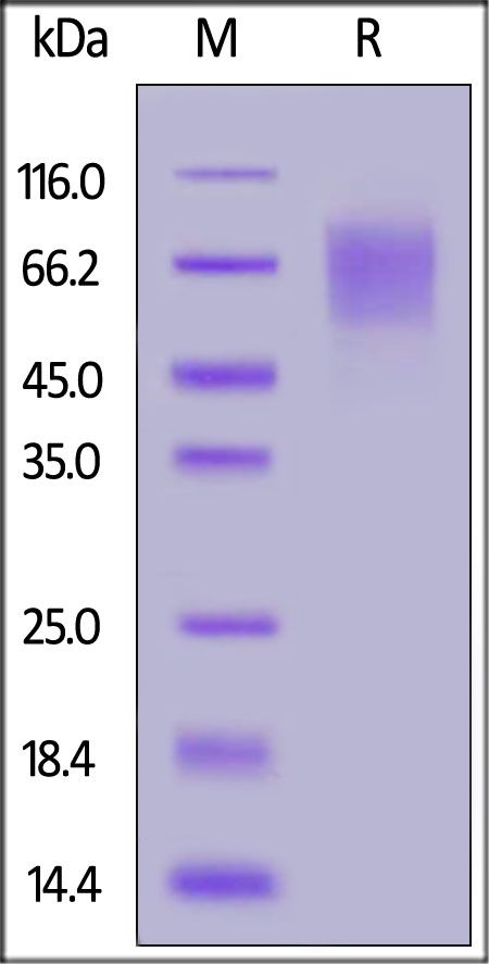 This protein carries an Avi tag (Avitag™) at the C-terminus, followed by a polyhistidine tag. The protein has a calculated MW of 41.11 kDa. The protein migrates as 55-90 kDa when calibrated against Star Ribbon Pre-stained Protein Marker under reducing (R) condition (SDS-PAGE) due to glycosylation.