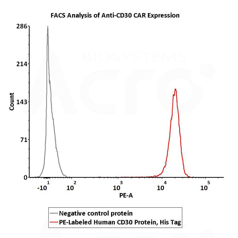PE-Labeled Human CD30, His Tag (CD0-HP2E3) is produced via site-specific conjugation of PE to Human CD30, His Tag under optimal conditions with a proprietary technology. Human CD30, His Tag is expressed from human 293 cells (HEK293). It contains AA Phe 19 - Lys 379 (Accession # NP_001234.2).