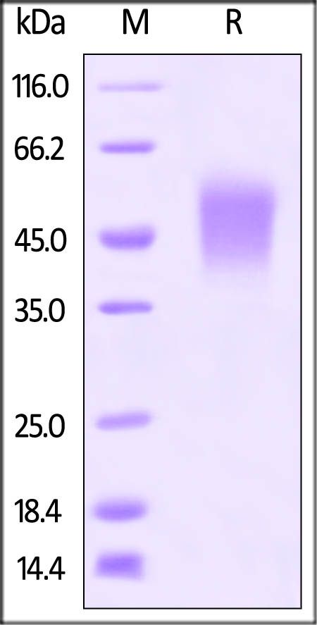 This protein carries a polyhistidine tag at the C-terminus. The protein has a calculated MW of 25.6 kDa. The protein migrates as 40-55 kDa under reducing (R) condition (SDS-PAGE) due to glycosylation.