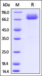 This protein carries a human IgG1 Fc tag at the C-terminus. The protein has a calculated MW of 50.3 kDa. The protein migrates as 66-90 kDa under reducing (R) condition (SDS-PAGE) due to glycosylation.