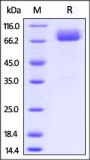 This protein carries a human IgG1 Fc tag at the C-terminus. The protein has a calculated MW of 50.3 kDa. The protein migrates as 66-90 kDa under reducing (R) condition (SDS-PAGE) due to glycosylation.