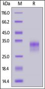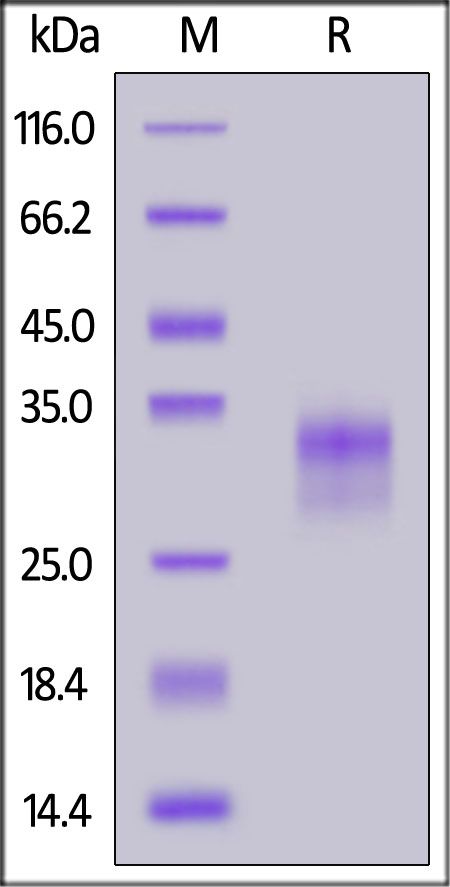 This protein carries a polyhistidine tag at the C-terminus. The protein has a calculated MW of 20.9 kDa. The protein migrates as 28-35 kDa under reducing (R) condition (SDS-PAGE) due to glycosylation.