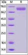 This protein carries a polyhistidine tag at the C-terminus. The protein has a calculated MW of 66.4 kDa. The protein migrates as 80-100 kDa under reducing (R) condition (SDS-PAGE) due to glycosylation.