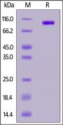 This protein carries a polyhistidine tag at the C-terminus. The protein has a calculated MW of 73.7 kDa. The protein migrates as 90-100 kDa when calibrated against Star Ribbon Pre-stained Protein Marker under reducing (R) condition (SDS-PAGE) due to glycosylation.