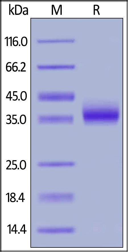 This protein carries a polyhistidine tag at the C-terminus. The protein has a calculated MW of 25.4 kDa. The protein migrates as 35-45 kDa under reducing (R) condition (SDS-PAGE) due to glycosylation.