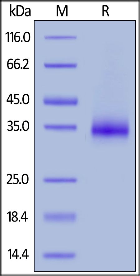 This protein carries a polyhistidine tag at the C-terminus. The protein has a calculated MW of 22.3 kDa. The protein migrates as 33-40 kDa when calibrated against Star Ribbon Pre-stained Protein Marker under reducing (R) condition (SDS-PAGE) due to glycosylation.