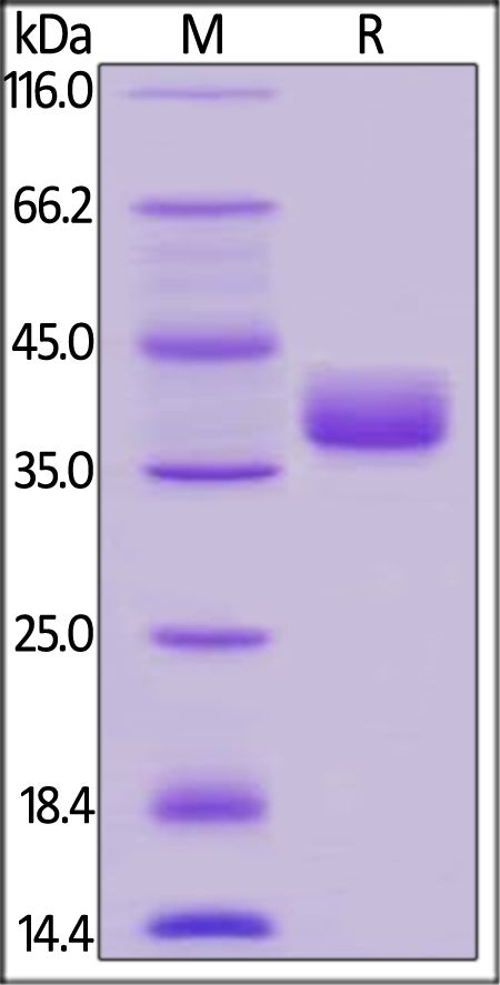 This protein carries a human IgG1 Fc tag at the C-terminus. The protein has a calculated MW of 27.9 kDa. The protein migrates as 38-43 kDa under reducing (R) condition (SDS-PAGE) due to glycosylation.