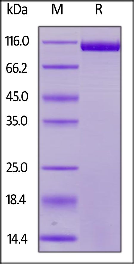 This protein carries a polyhistidine tag at the C-terminus. The protein has a calculated MW of 77.03 kDa. The protein migrates as 90-116 kDa when calibrated against Star Ribbon Pre-stained Protein Marker under reducing (R) condition (SDS-PAGE) due to glycosylation.