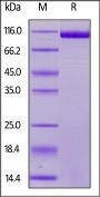 This protein carries a polyhistidine tag at the C-terminus. The protein has a calculated MW of 77.03 kDa. The protein migrates as 90-116 kDa when calibrated against Star Ribbon Pre-stained Protein Marker under reducing (R) condition (SDS-PAGE) due to glycosylation.