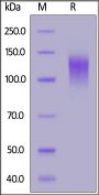 This protein carries a polyhistidine tag at the C-terminus. The protein has a calculated MW of 77.1 kDa. The protein migrates as 100-150 kDa under reducing (R) condition (SDS-PAGE) due to glycosylation.