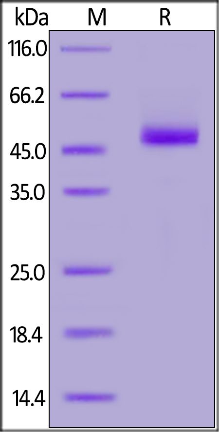 This protein carries a human IgG1 Fc tag at the C-terminus. The protein has a calculated MW of 38.6 kDa. The protein migrates as 46-55 kDa under reducing (R) condition (SDS-PAGE) due to glycosylation.