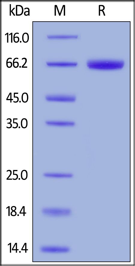 This protein carries a human IgG1 Fc tag at the C-terminus. The protein has a calculated MW of 52.9 kDa. The protein migrates as 64-85 kDa under reducing (R) condition (SDS-PAGE) due to glycosylation.