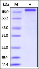 This protein carries a polyhistidine tag at the C-terminus. The protein has a calculated MW of 110.4 kDa. The protein migrates as 100-130 kDa when calibrated against Star Ribbon Pre-stained Protein Marker under reducing (R) condition (SDS-PAGE) due to glycosylation.