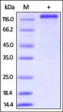 This protein carries a polyhistidine tag at the C-terminus. The protein has a calculated MW of 110.4 kDa. The protein migrates as 100-130 kDa when calibrated against Star Ribbon Pre-stained Protein Marker under reducing (R) condition (SDS-PAGE) due to glycosylation.