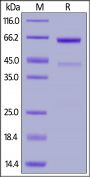 This protein carries a polyhistidine tag at the C-terminus, followed by an Avi tag (Avitag™). The protein has a calculated MW of 61.7 kDa. The protein migrates as 60 kDa under reducing (R) condition (SDS-PAGE) due to glycosylation.