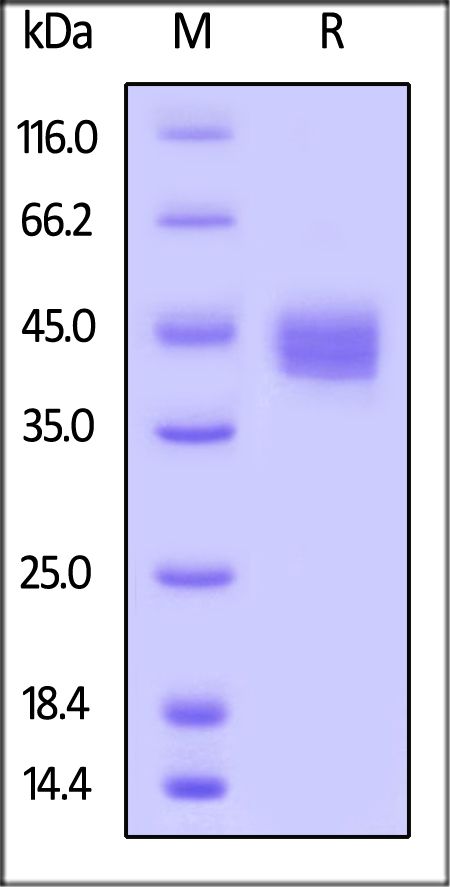 This protein carries a polyhistidine tag at the N-terminus, followed by an Avi tag (Avitag™). The protein has a calculated MW of 34.2 kDa. The protein migrates as 40-46 kDa under reducing (R) condition (SDS-PAGE) due to glycosylation.