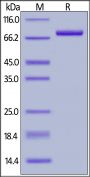This protein carries a human IgG1 Fc tag at the C-terminus. The protein has a calculated MW of 67.0 kDa. The protein migrates as 67-85 kDa under reducing (R) condition (SDS-PAGE) due to glycosylation.