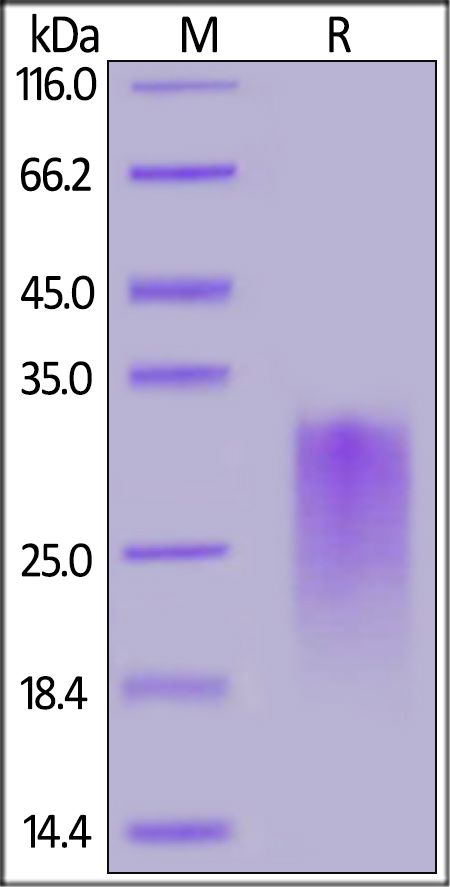 This protein carries a polyhistidine tag at the C-terminus. The protein has a calculated MW of 5.0 kDa. The protein migrates as 28-40 kDa when calibrated against Star Ribbon Pre-stained Protein Marker under reducing (R) condition (SDS-PAGE) due to glycosylation.