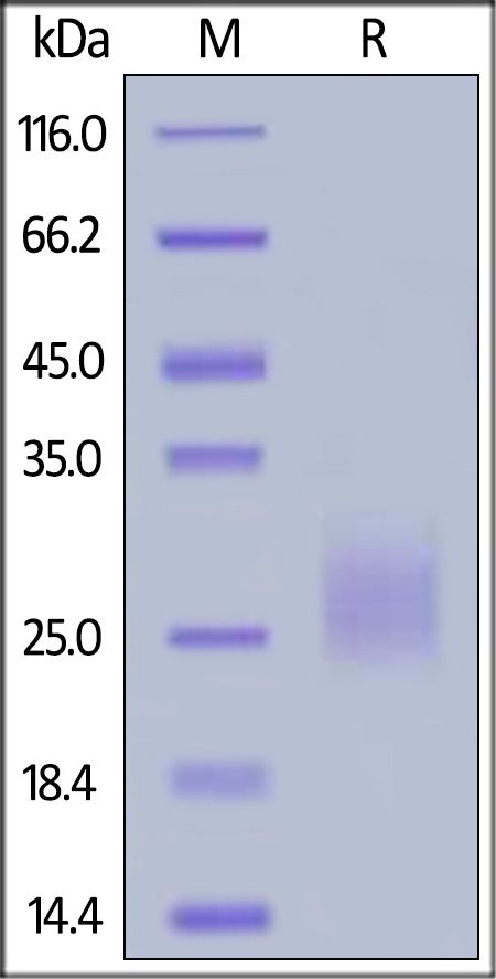 This protein carries a polyhistidine tag at the C-terminus. The protein has a calculated MW of 19.1 kDa. The protein migrates as 24-30 kDa when calibrated against Star Ribbon Pre-stained Protein Marker under reducing (R) condition (SDS-PAGE) due to glycosylation.