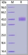 This protein carries a human IgG1 Fc tag at the C-terminus, followed by an Avi tag (Avitag™). The protein has a calculated MW of 31.4 kDa. The protein migrates as 40-55 kDa under reducing (R) condition (SDS-PAGE) due to glycosylation.