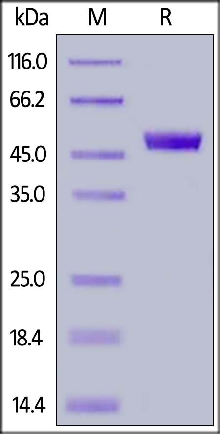 This protein carries a polyhistidine tag at the C-terminus. The protein has a calculated MW of 41.5 kDa. The protein migrates as 45-55 kDa under reducing (R) condition (SDS-PAGE) due to glycosylation.