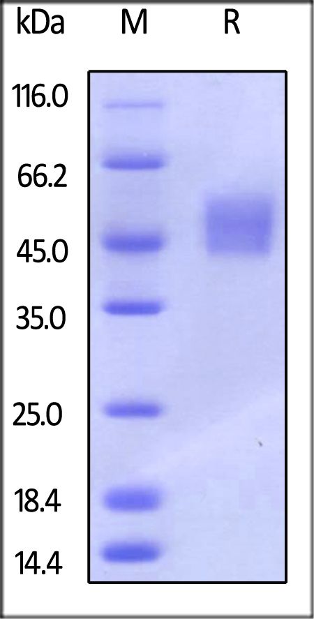 This protein carries a polyhistidine tag at the C-terminus. The protein has a calculated MW of 32.3 kDa. The protein migrates as 40-55 kDa under reducing (R) condition (SDS-PAGE) due to glycosylation.